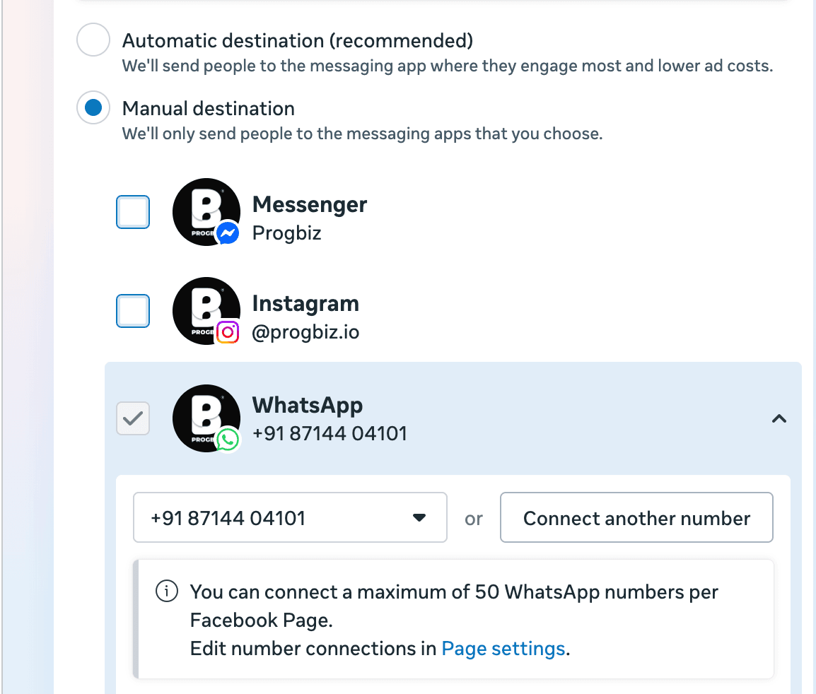 To set up ads for WhatsApp, you need a phone number attached to a Facebook page. Progbiz ensures your WhatsApp Business number is attached to your Facebook page and you have admin access to it. We will walk you through the Settings → WhatsApp section of Meta Business Suite and verify your number.